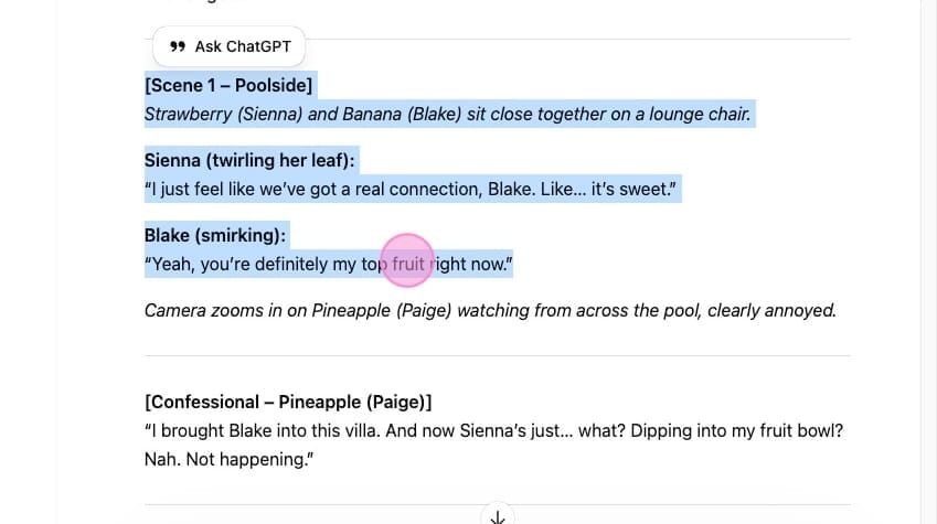 Go to chatgpt and type in this prompt "Write a 2 minute script for a Love Island style episode with fruit characters. Create a dramatic scenario, and write dialogue and scene descriptions."