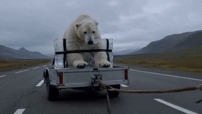 Prompt: A polar bear sits huddled inside a clear frozen ice block, strapped securely to a small silver utility trailer. The camera follows the trailer pulled by a cord at eye level, then pans to the right to reveal a goat pulling the trailer.
