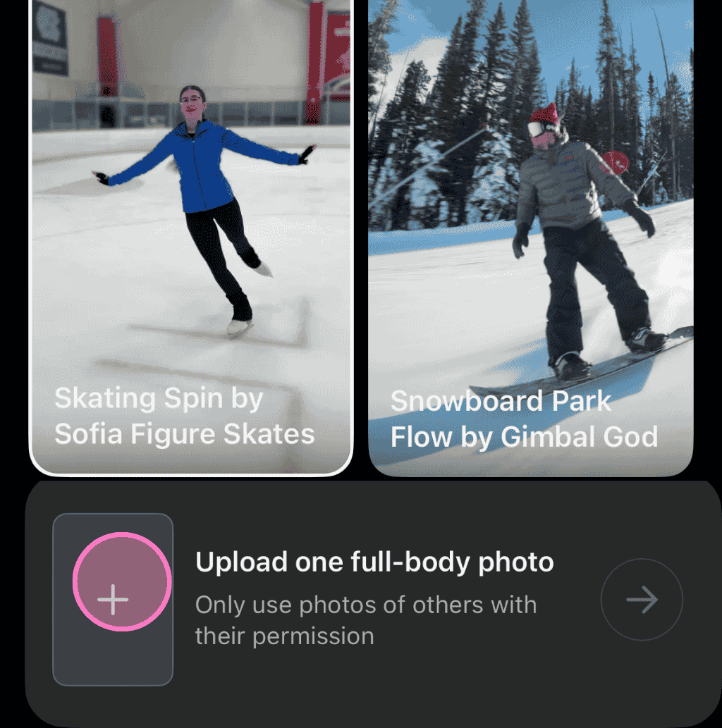 Select "Make Me Move." Browse the motion library. Pick a preset like "Skating Spin by Sofia" (figure skates) or "Snowboard Park Flow."